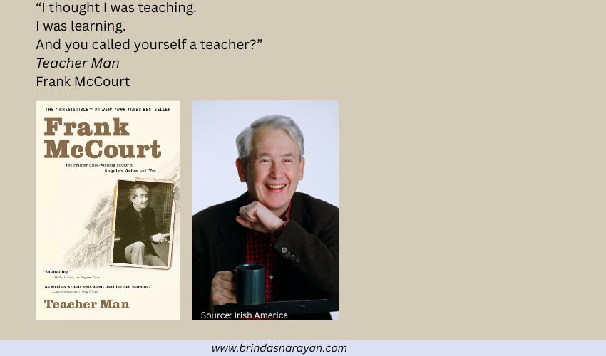 Though I’m not a teacher, I’m both curious about and fascinated by the promise and betrayals of education. Somehow the recent Teacher’s Day triggered a desire to reread Frank McCourt’s Teacher Man, a book I had bought many years ago in Austin, Texas, when my own kids were being strung through various education systems. I had read Teacher Man then, but perhaps the first reading was colored by the fidgety apprehensions of a parent, who’s never sure of what should be done or not to teach one’s own kids. This time around, I could enter the book as one might a theatre, to watch McCourt’s impish and imaginative cavorting in some of the toughest classroom environments in New York City.
