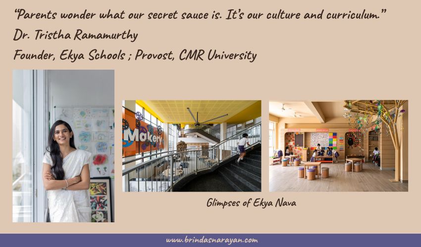 She currently oversees 7000 students across 13 K-12 institutions. And 12,000 students enrolled in higher education. At this stage, while Tristha’s parents serve as sounding boards for strategic decisions, she and her brother are primarily responsible for the Ekya and CMR organizations. Her brother handles the infrastructure, while Tristha runs the academic and operational aspects.
